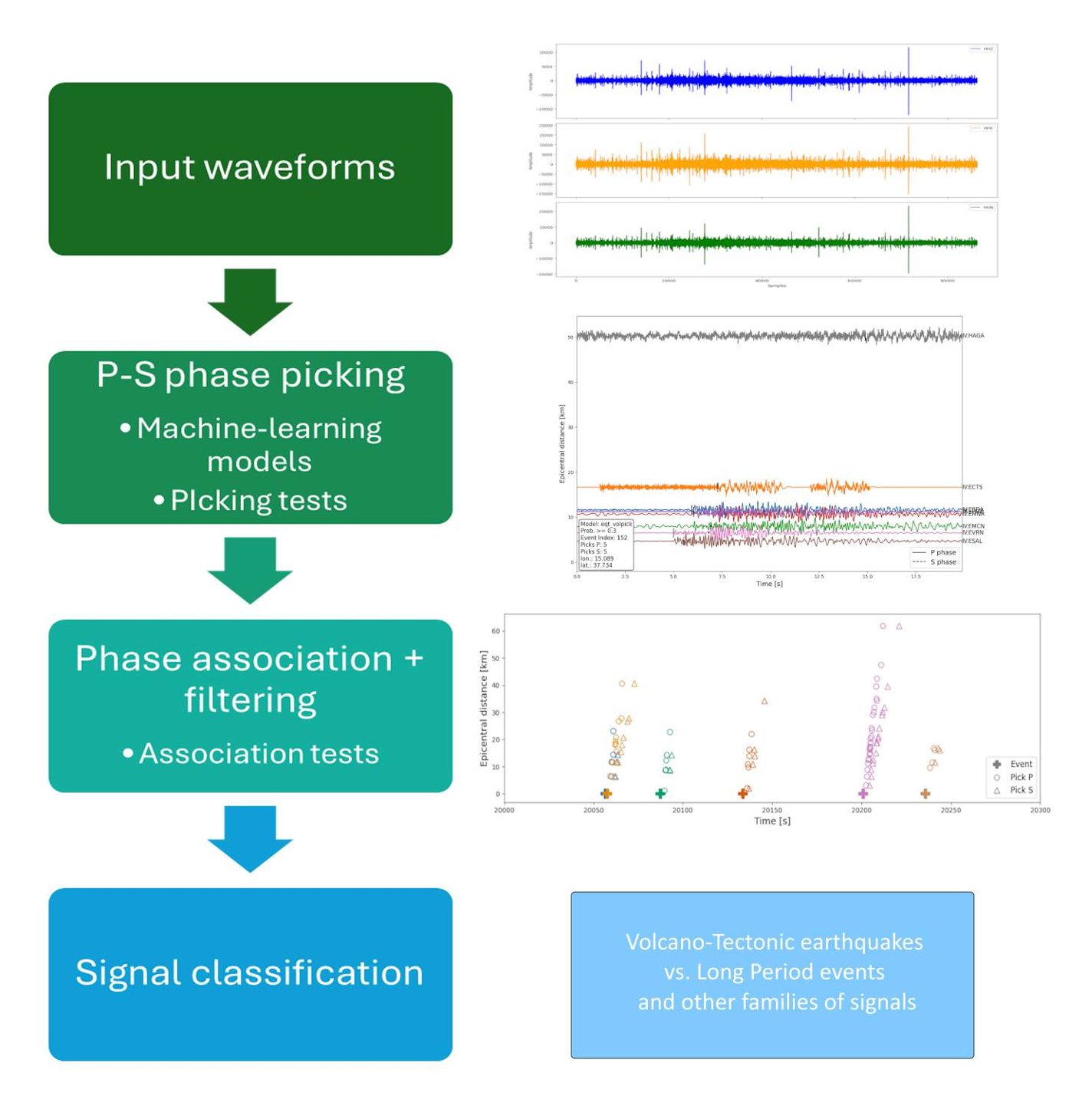 This project enables data analysis of complex seismic waveforms in volcanic areas where the signals are influenced by multiple seismic sources mainly related to the presence of fluids and the brittle fractures under stress within the volcanic structure. Conventional picking methods and phase associators can encounter difficulties with such complex waveforms. The ultimate goal is to find an automatic way to distinguish between the two main families of seismic signals caused by Volcano-Tectonic earthquakes and Long-Period events using machine learning models and seismological techniques.