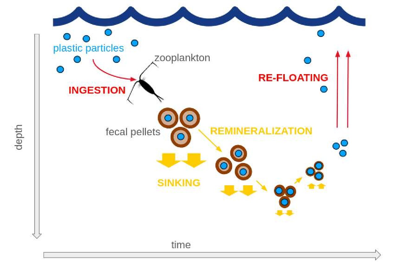Scheme of the processes affecting microplastic particles following ingestion by zooplankton, including fecal pellet formation, sinking, remineralization, and potential re-floating of the particles.