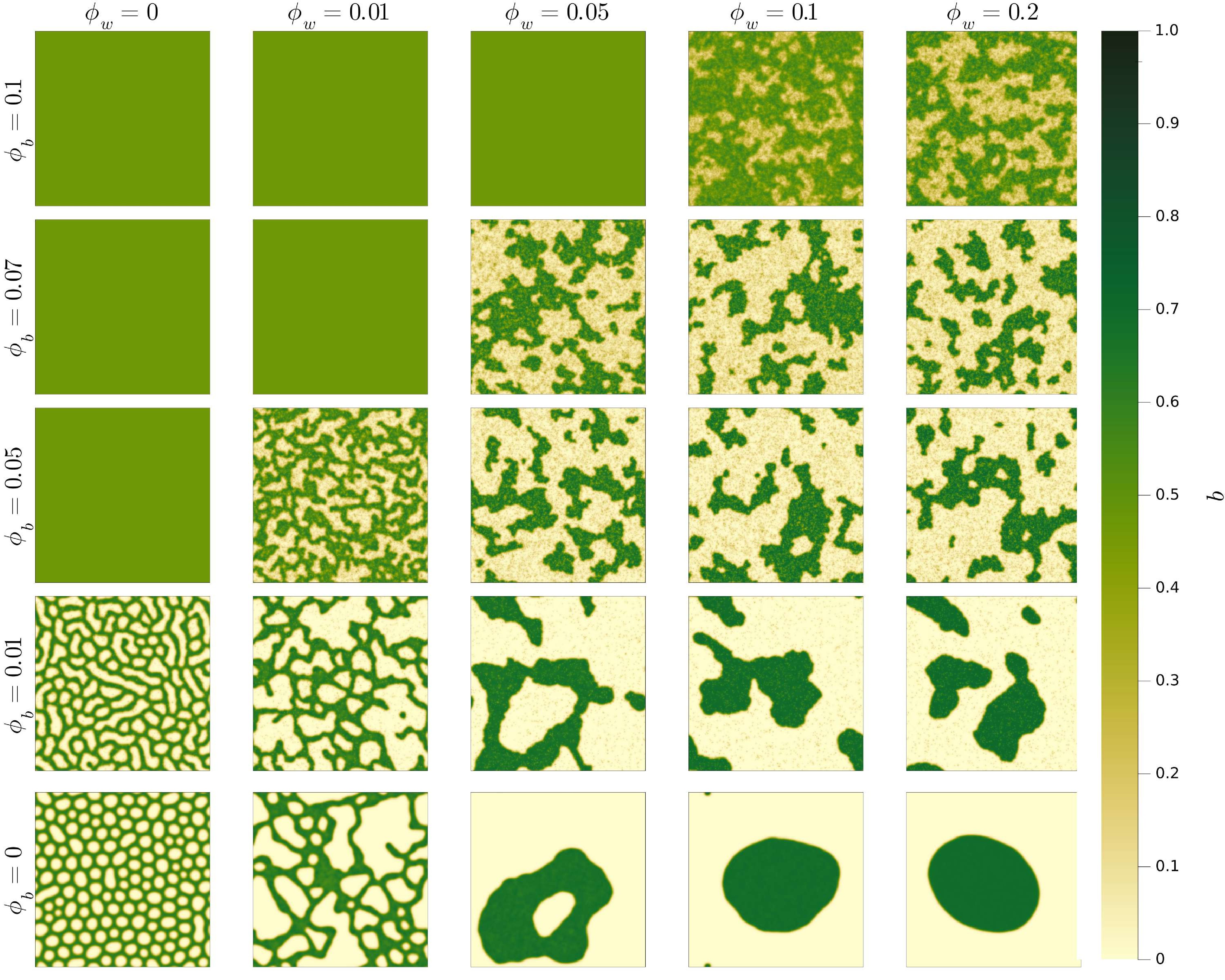 Simulations of stable patterns emerging for different combinations of the parameters ϕ_b and ϕ_w, at a fixed precipitation value we notice the prevalence of broad patch size patterns. Each simulation was 5000 adimentional times long and the domain size was 400x400.